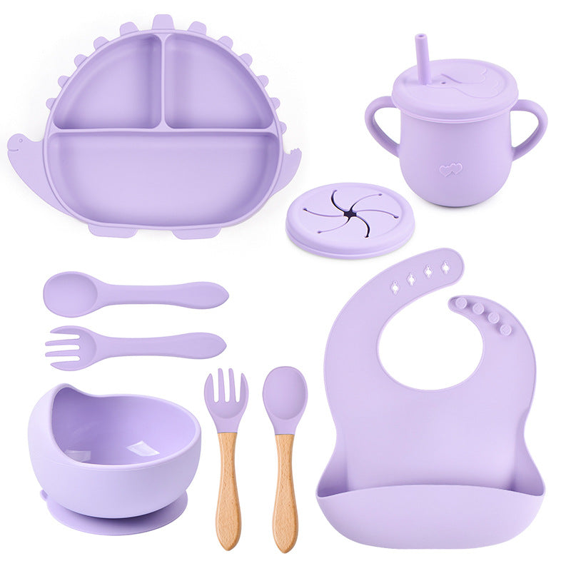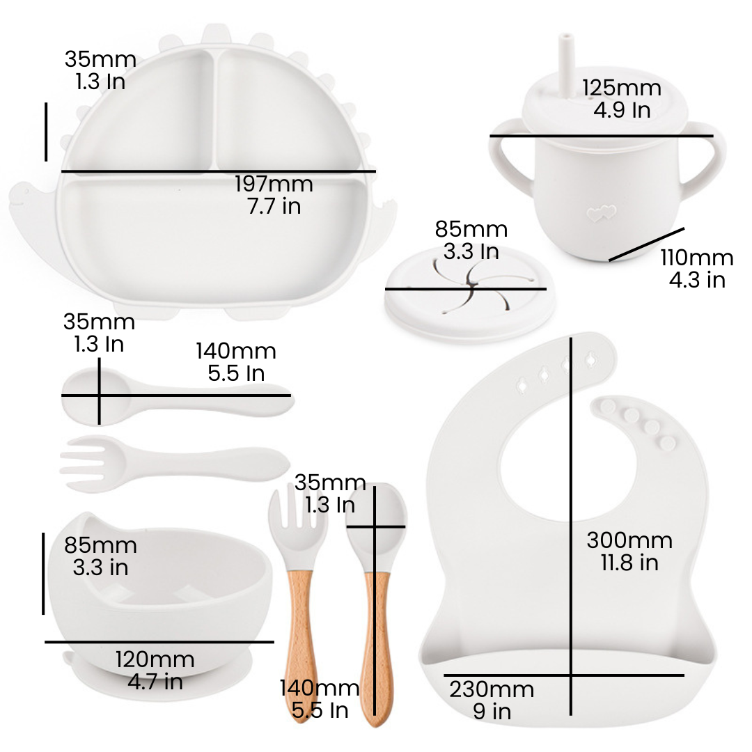 Our dining set includes everything you need for feeding your child, all in one convenient package. It features a silicone plate, bowl, cup, spoon, fork, and bib, providing you with all the essentials for a successful mealtime.